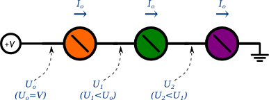 При последовательном подключении сила тока в каждом потребителе — одна и та же, различается напряжение: в каждом компоненте падает его часть.
