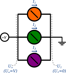 При параллельном подключении напряжение вокруг каждого потребителя — одно и то же, различается сила тока: каждый потребляет ток в соответствии с собственным сопротивлением.
