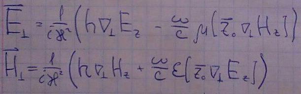 Из данных систем получим выражения, представляющие значения поперечных компонент электромагнитного поля через производные от продольных компонент (1.2<=>2.1; 1.1<=>2.2):