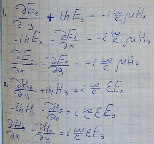 Подставим ожидаемые решения в уравнения Максвелла. Переходя к записи ротора в декартовой системе координат для двух предыдущих уравнений и, группируя соответствующие компоненты, получим следующие выражения: