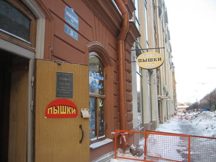 Они были на каждом шагу и предлагали пышки по смешной цене: что-то около 3 руб. за пышку, а тремя или четырьмя пышками вообще можно было объесться, хотя кто-то брал сразу десять, чтобы не мелочиться. Сервисом, естественно, там и не пахло: обыкновенные забегаловские стоячие столы, чай в пластиковых стаканчиках, растворимое кофе, а сами пышки, посыпанные сахарной пудрой, выдавались на бумажной тарелочке в комплекте с салфетками, зато было вкусно, сытно и невероятно калорийно (недиетический вариант). Увы, постепенно все пышечные стали закрываться, и в городе осталось их очень мало (можно пересчитать по пальцам рук), но среди них несомненно лидирует известная пышечная на Большой Конюшенной 25 в бывшем здании Франуцзско-немецкой реформаторской церкви, сохранившая все традиции этих заведений.
