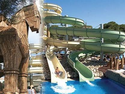 Открылся аквапарк в 2005 году. Его центральную часть украшает легендарный Троянский конь, как говорят, в натуральную величину. Отсюда и берут свое начало самые любимые туристами огромные горки. В парке можно совершить путешествие по реке с пещерами, оригинальными аттракционами. Любят посетители подъемную горку, где с помощью потока воды их забрасывает на площадку, а далее их ждет бассейн. Любители волн и серфинга найдут бассейн с искусственными волнами. Многие выбирают очень крутую горку «Камикадзе».