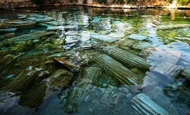 Ощущения купальщика сказочные: вода с температурой в 36 градусов наполнена тысячами пузырьков, которые окутывают все тело. Как будто в шампанское окунается человек, заняв в бассейне место великой царицы. На дне этого озера лежат колонны из белого мрамора. Они оказались здесь после землетрясения.