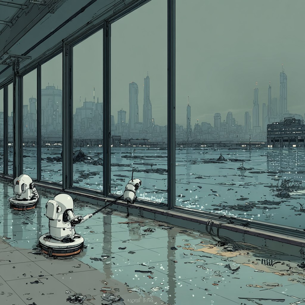 Две тысячи пятьдесят восьмой год от Рождества Христова. Дождь. Вечный кислотный дождь двадцать третьего года Петли стекал по окнам заброшенной школы. За стеклом, в сером полумраке, двигались фигуры. Не люди. Роботы. Уборщики-амфибии скользили по затопленным тротуарам, их щетки монотонно сгребали несуществующий мусор в разбитые ливневки. Высоко над улицей, игнорируя сильные порывы ветра, ползли по стенам небоскребов скалолазы-ремонтники. Их манипуляторы методично, с безупречной точностью, заделывали трещины в бетоне, который все равно медленно осыпался ниже. Бессмысленный ритуал обслуживания умирающего тела города. Рутинные операции, записанные в петлю вечности, выполнялись с мертвой эффективностью. Люди не отдавали  им приказов. Система - Петля, родившаяся после коллапса,  сама для себя генерировала задачи, поддерживая видимость порядка в агонии.