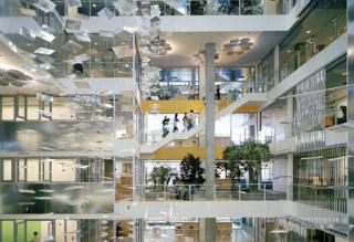 - Не визуальная связь с природой (естественная вентиляция, солнечные пятна, текстурированные материалы, звуки птиц, погода, запахи природы) -комфортный климат в здании осуществляется без системы кондиционирования: проницаемый для воздушных потоков атриум охлаждается с помощью естественной вентиляции.