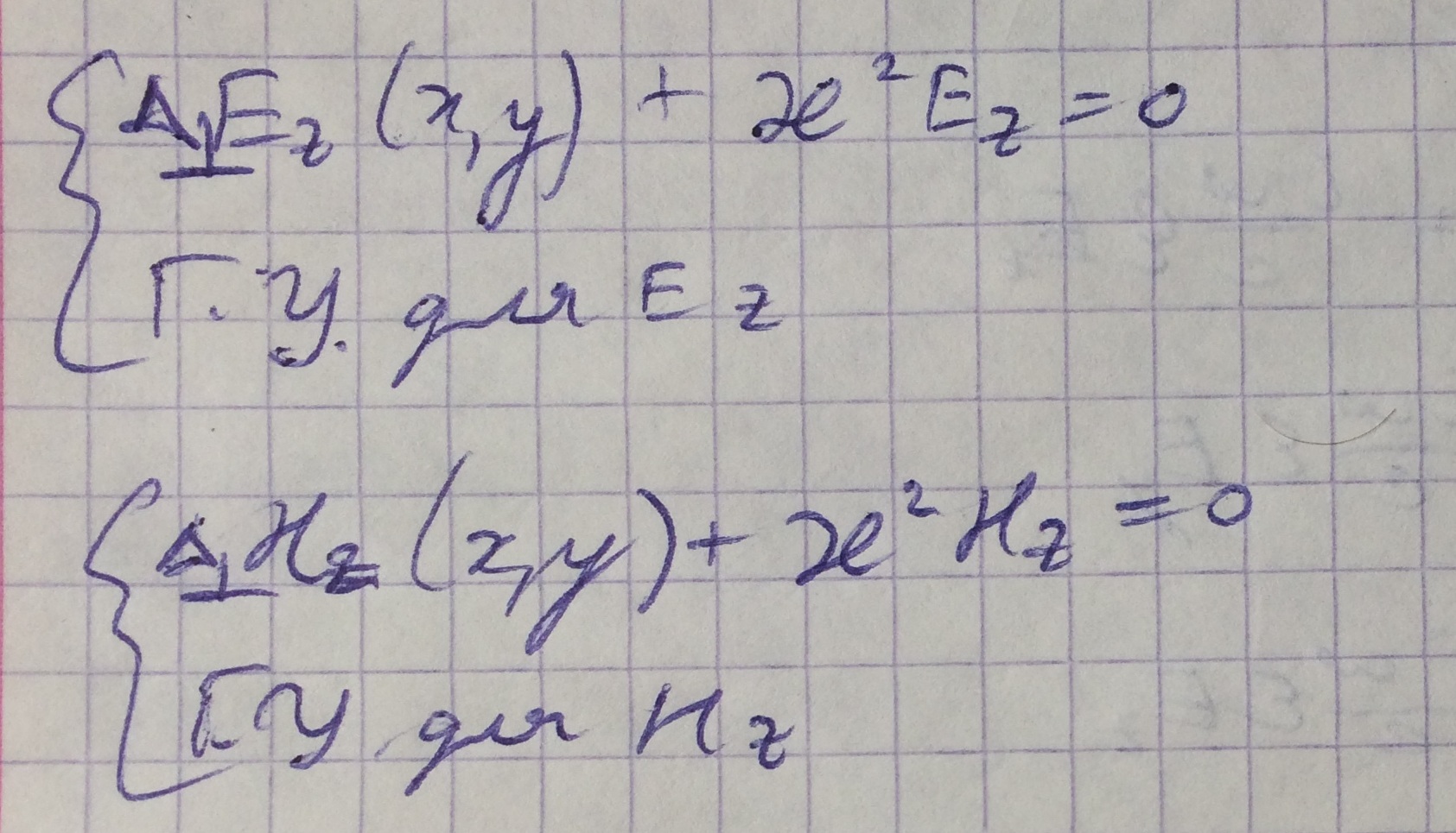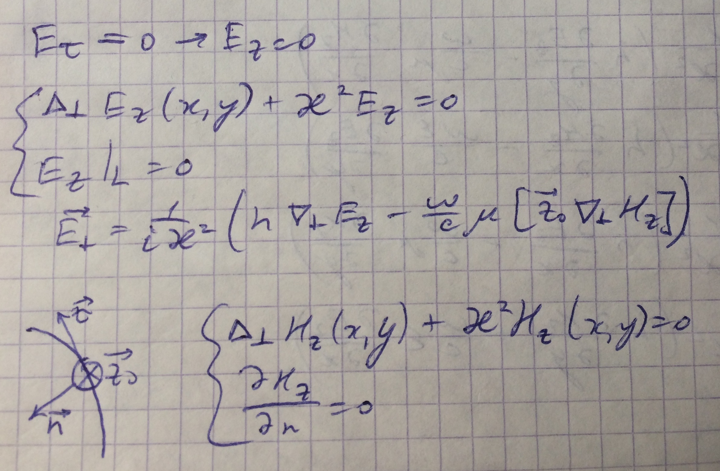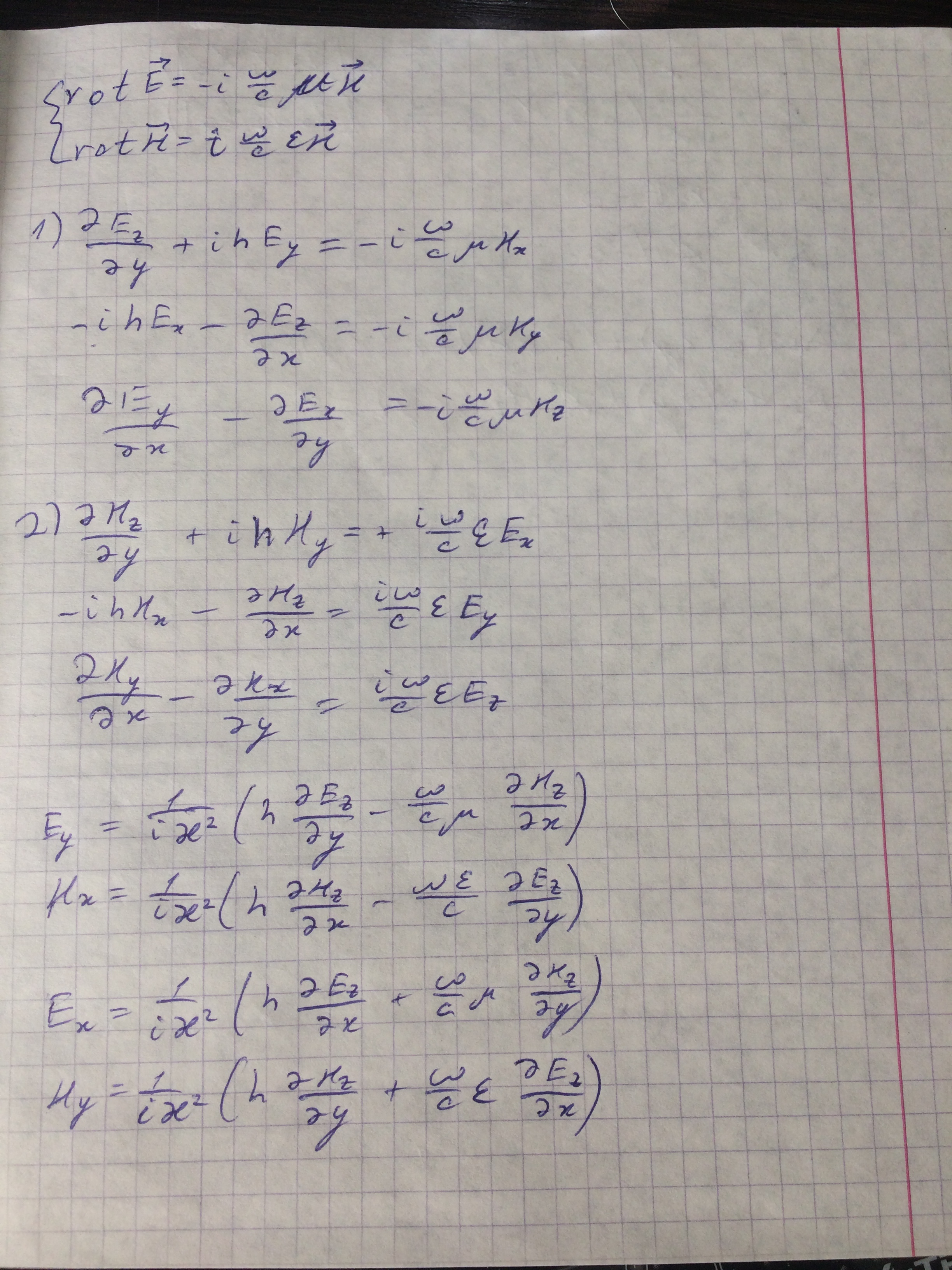 Из двух систем получим выражения для поперечных компонент (по x,y) полей через производные от продольных компонент (по z).