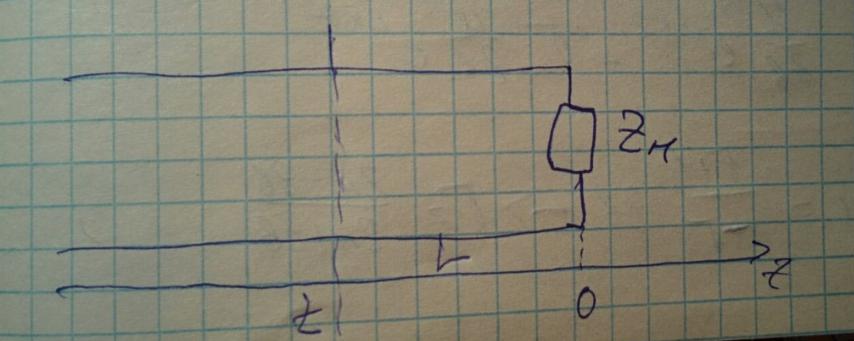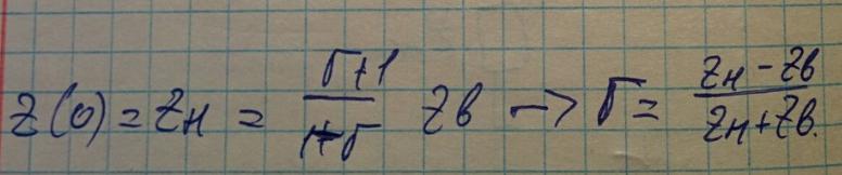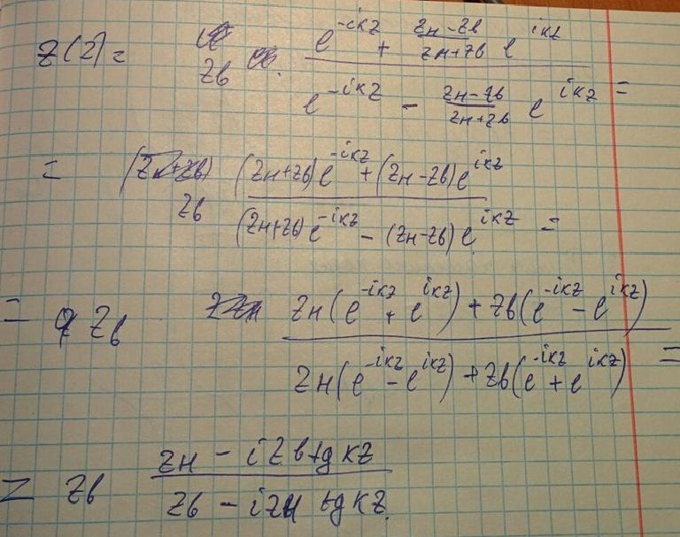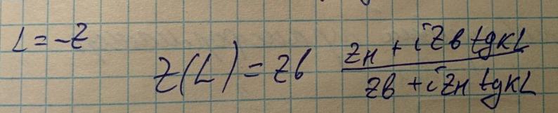 Воспользуемся граничным условием, тоесть то, что импеданс в начале координат равен импедансу нагрузки. Из него выразим коэффициент отражения, которе подставим в значение имеданса в сечении. Получим искомую формулу пересчета импедансов: