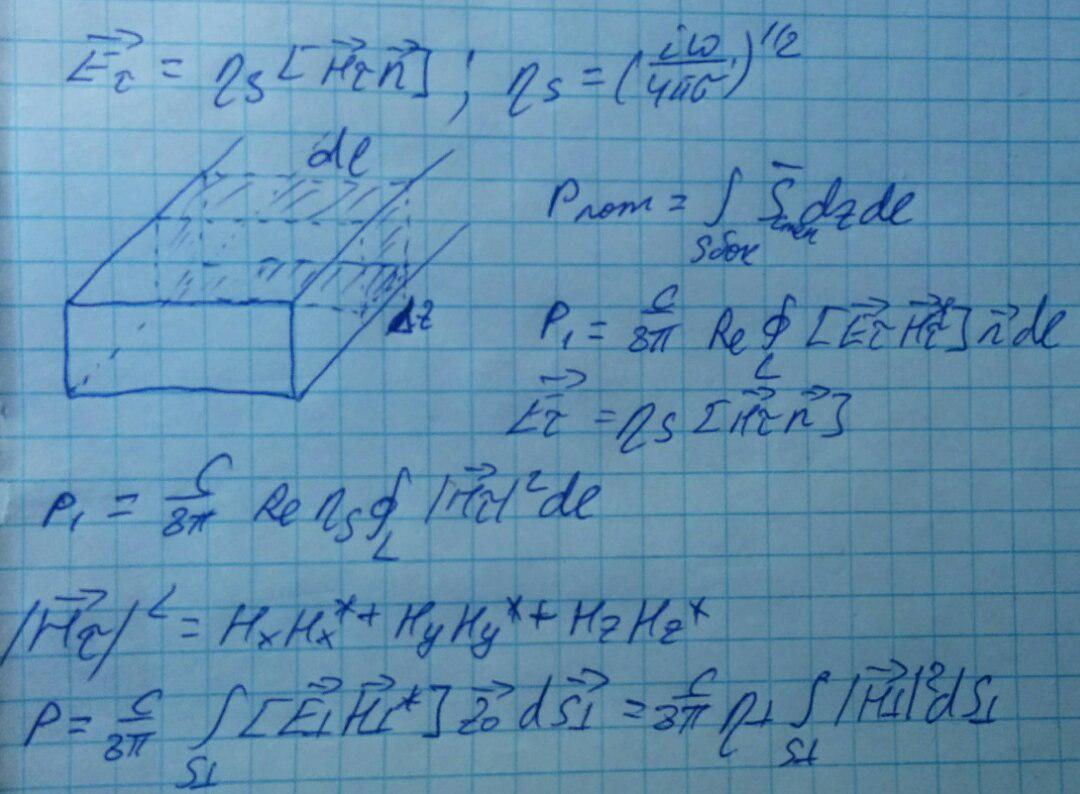 Но в волноводе с потерями не знаем переносимую и потерянную мощность. Поэтому введем предположение, что потери в волноводе маленькие и структура полей мод в волноводе с потерями такая же как и без потерь в нулевом приближении. Что бы энергия уходила на нагрев стенки необходимо, что бы компонента вектора пойтинга была направлена в стенку волновода. Мощность, потерянную на единицу длины, определим через тангенсальную составляющую полей, для этого используем граничные условия Леонтовича. Тангенсальную компоненту поля берем такую же как и без потерь.