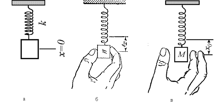 Обсудим реализацию гармонического осциллятора на примере пружинного маятника. Собственные колебания пружинного маятника. Пружинный маятник состоит из тела массы m и легкой пружины с коэффициентом жесткости k (рис.1, а). В общем случае движение пружинного маятника в поле силы тяжести довольно сложно и описывается большим числом степеней свободы. Практический интерес, однако, представляют колебания с одной степенью свободы, когда движение маятника происходит вдоль вертикальной оси. Для того, чтобы маятник совершал только вертикальные колебания достаточно оттянуть тело строго вниз на небольшую величину (рис.1, б,в ). Для полного описания колебаний в этом случае необходимо знать поведение только одной переменной, например, вертикальной координаты центра масс тела маятника. На тело, подвешенное на пружине в поле силы тяжести действуют две силы (без учета сил трения) сила тяготения и упругая сила. Начало координат выберем таким образом, чтобы при х=О масса mнаходилась в равновесии. При этом сила тяжести mg будет скомпенсирована некоторым начальным растяжением пружины и в дальнейшем рассмотрении участвовать не будет. При отклонении тела от точки равновесия будет возникать возвращающая сила F(х). Рассмотрим малые колония пружинного маятника. Колебания пружиннного маятника называют малыми, если сила, возникающая при смещении грузика от положения равновесия, пропорциональна его смешению и направлена в сторону положения равновесия. Для пружиннного маятника условия малости колебаний удовлетворяются при смещениях, создающих возвращающую силу у пружины в пределах применимости закона Гука. Уравнение движения пружинного маятника при этом имеет вид |