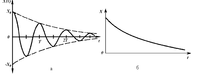 Отклонения маятника от положения равновесия в зависимости от времени в соответствии с (6) имеет вид показанный на рис. 2,a. Для малых декрементов затухания колебания близки к гармоническим, при больших затухание происходит за 1—2 периода. В том случае, когда w0 значение частоты w становится мнимым и гармонические колебания не реализуются, происходит апериодический процесс—тело маятника после начального отклонения плавно возвращается в положение равновесия (см. рис.2, б), Величина получила название декремента затухания. При этом величина равна времени, за которое амплитуда колебаний затухает в е раз. Затухание колебаний за период = Т носит название логарифмического декремента затухания, его можно определить из соотношения ![]() |