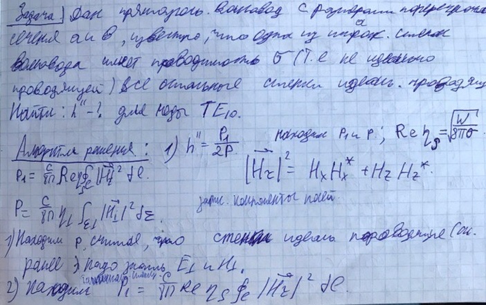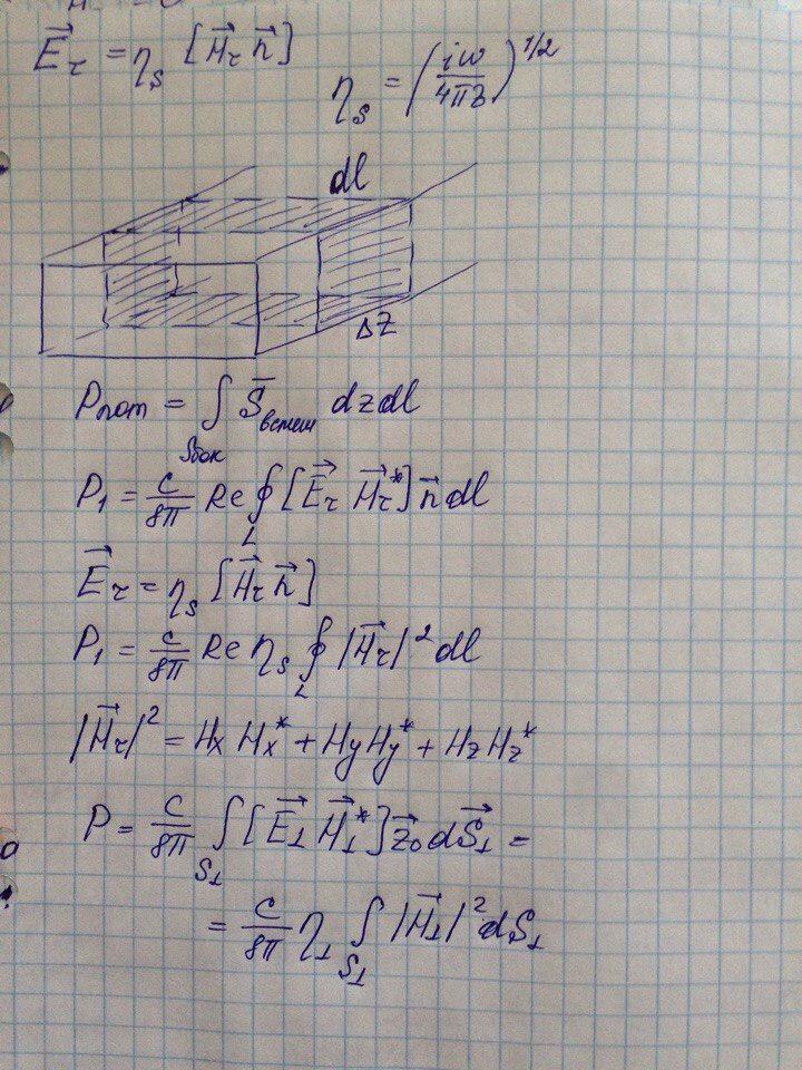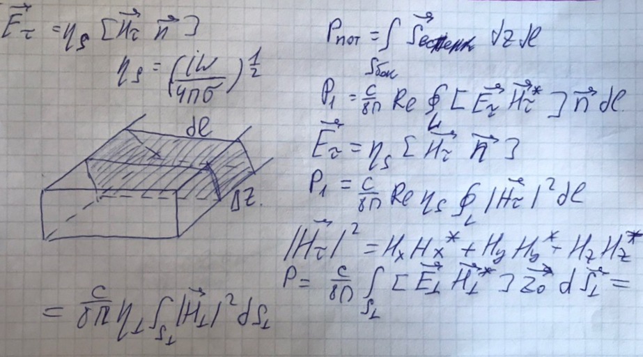 Но в волноводе с потерями не знаем переносимую и потерянную мощность. Поэтому введем предположение, что потери в волноводе маленькие и структура полей мод в волноводе с потерями такая же как и без потерь в нулевом приближении. Что бы энергия уходила на нагрев стенки необходимо, что бы компонента вектора пойтинга была направлена в стенку волновода. Мощность, потерянную на единицу длины, определим через тангенсальную составляющую полей, для этого используем граничные условия Леонтовича. Тангенсальную компоненту поля берем такую же как и без потерь.