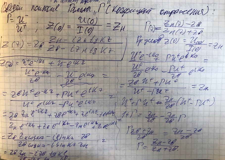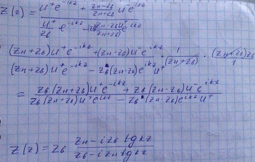 Воспользуемся граничным условием, тоесть то, что импеданс в начале координат равен импедансу нагрузки. Из него выразим коэффициент отражения, которе подставим в значение имеданса в сечении: