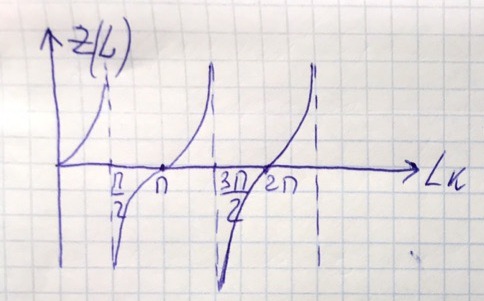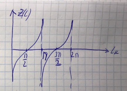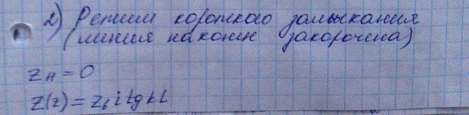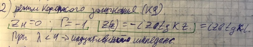2. Режим короткого замыкания (Случай когда линия закорочена). При данном режиме работы импеданс нагрузки равен нулю, соответственно коэффициент отражения равен минус единице, а из формулы пересчета импедансов следует: