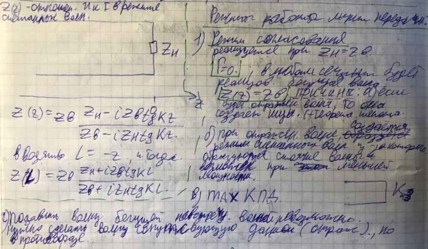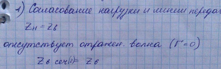 1. Режим согласования. При данном режиме работы импеданс нагрузки равен волновому сопротивлению, из чего следует что коэффициент отражения равен 0. Значит в данном случае нет встречной волны, которая повышает уровень шума и уменьшает скорость переноса информации. В данном случае вся энергия поглащается нагрузкой. Из формулы пересчета импеданса следует: