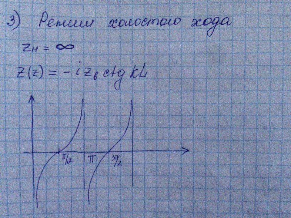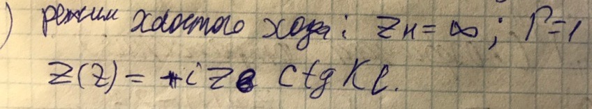 3. Режим холостого хода. При данном режиме импеданс нагрузки равен бесконечности, соотвественно коэффициент отражения равен единице, а импеданс в сечении по формуле пересчета импедансов равен: