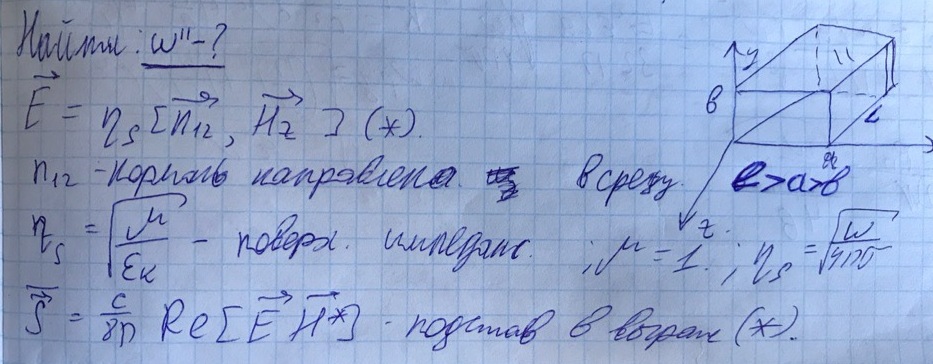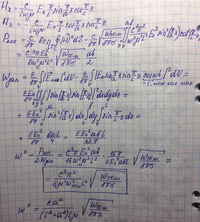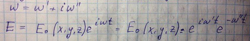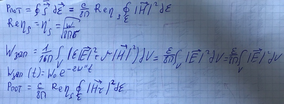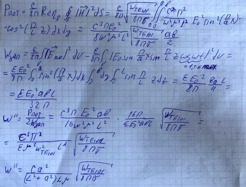 Рассмотрим резонатор с потерями, но на тех же модах что и без потерь. Затухания в таком резонаторе характеризуются мнимой частью комплексной частоты (декрементом затухания) . Определим данную величину для прямоугольного резонатора.