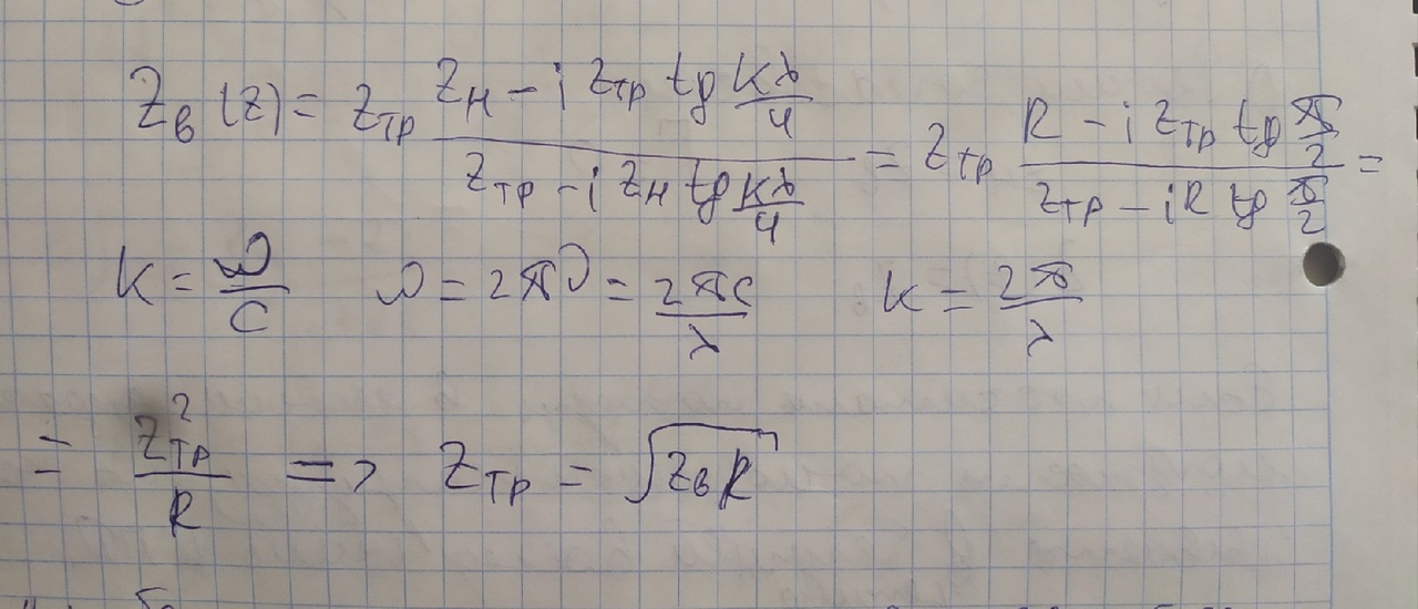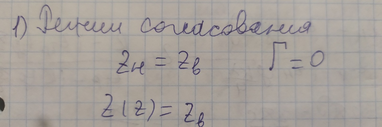 1. Режим согласования. При данном режиме работы импеданс нагрузки равен волновому сопротивлению, из чего следует что коэффициент отражения равен 0. Значит в данном случае нет встречной волны, которая повышает уровень шума и уменьшает скорость переноса информации. В данном случае вся энергия поглащается нагрузкой. Из формулы пересчета импеданса следует: