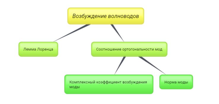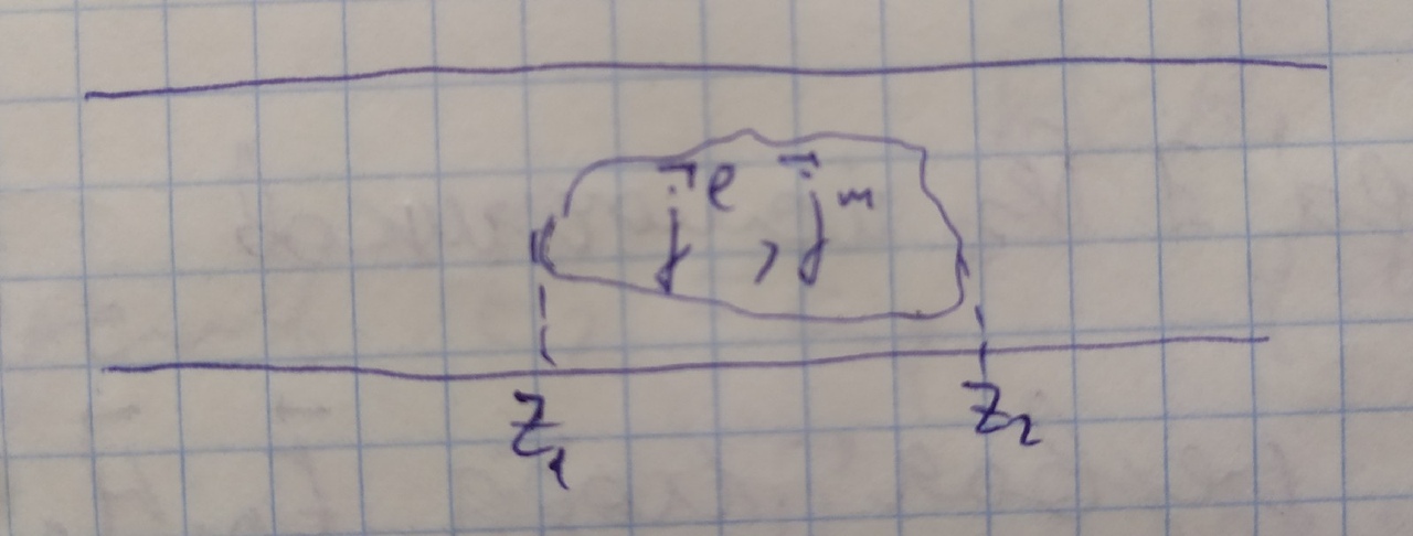 Найдем поля, возбуждаемые заданными токами в волноводе. Поля, которые возбуждаются заданными источниками - это сумма мод волн. Рассмотрим поля, возбуждаемые на заданных частотах. Для этого потребуется вспомогательное соотношение, так как в волноводе существует конечное число распространяющихся мод, следовательно их сумма будет тоже конечной. Таким вспомогательным соотношением является лемма Лоренца.