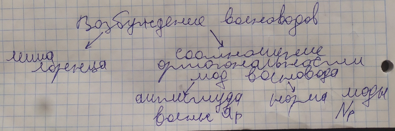 Рассмотрим произвольный волновод с идеально проводящими стенками, в котором заданы соответствующие распределения, локализованные в определенной точке пространства. Из визических соображений справа наблюдается набор мод, бегущих вправо, слева набор мод, бегущих влево.
