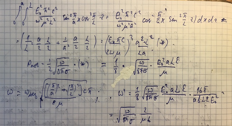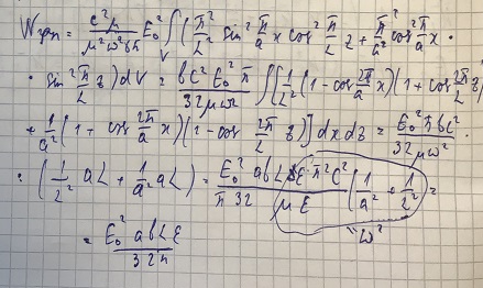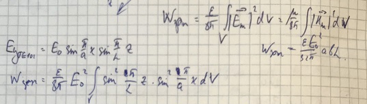 Рассмотрим волну типа ТЕ101. Запишем для этой волны компоненту электрического поля и найдём энергию, запасённую в резонаторе следующим образом: