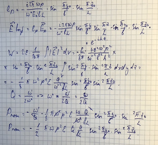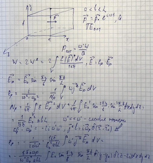 Дан резонатор с размерами a,b и L (a<b<L). В резонаторе в т. (x0,y0,z0) находится диполь с дипольным мометом р на частоте w. Найти: мощность, рассеиваемую в стенках резонатора, если известна добротность резонатора Q.