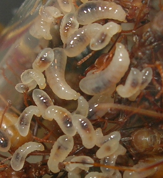 Вторая стадия начинается с вылупления из яйца личинки. Сначала она очень маленькая, но уже может двигаться и питаться. Самка или рабочие особи кормят личинку, отрыгивая питательную смесь из своих социальных желудков. Скорость роста личинки зависит от температуры. Чем выше тем быстрее личинка растет. Ее питание определяет то, к какой муравьиной касте будет принадлежать будущий муравей. Она может стать рабочим, солдатом, молодой королевой или самцом. Выживание личинки полностью заисит от самки или рабочих муравьев. Они поддерживают необходимый уровеь влажности. Стадия личинки длиться от 2 недель до месяца.